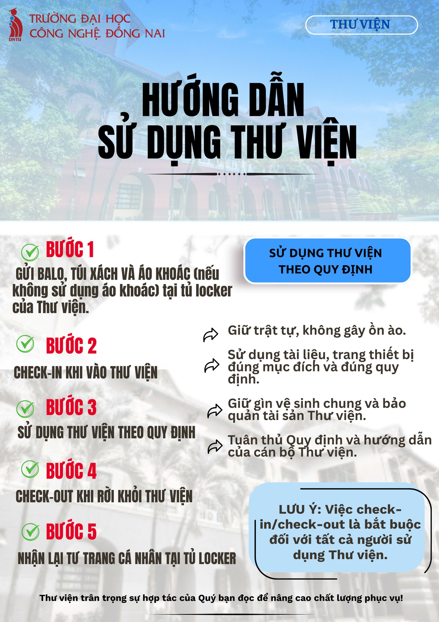 Nhằm bảo đảm công tác quản lý, giữ gìn trật tự, an ninh và nâng cao chất lượng phục vụ bạn đọc, Thư viện Trường Đại học Công nghệ Đồng Nai trân trọng đề nghị quý bạn đọc thực hiện đúng các quy định khi sử dụng Thư viện, cụ thể như sau: